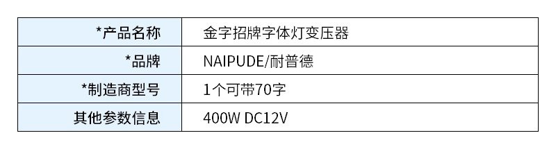 耐普德 金字招牌字体灯变压器 400W DC12V 可带70字 1个