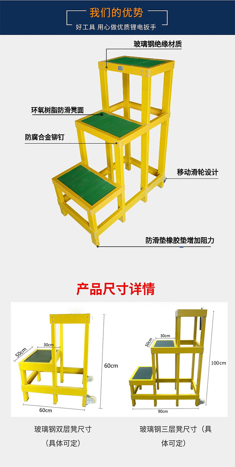 海斯迪克 电力绝缘凳 KC18-5 玻璃钢 50*90*100cm 三层 1件