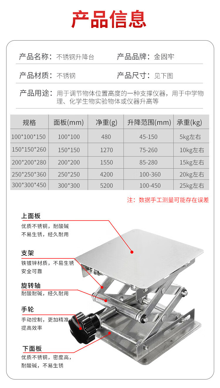 金固牢 实验室手动不锈钢升降台 HM-167 100*100mm 1个