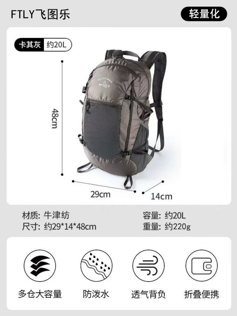飞图乐 轻量化徒步背包 TBB0100 卡其色 1个