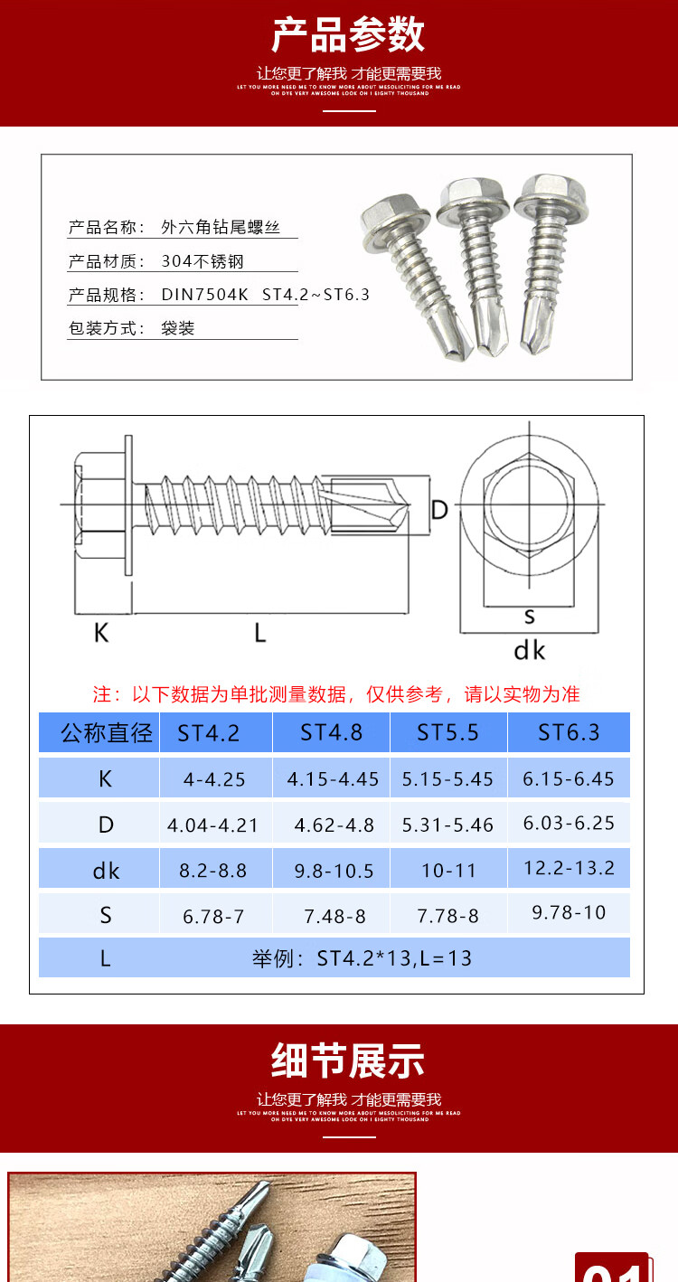 • 商品名称:海斯迪克 304不锈钢六角法兰面自攻自钻螺钉