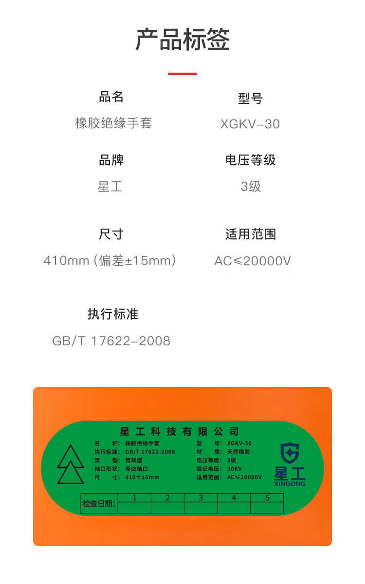 星工 30KV绝缘手套 XGKV-30 410mm 3级 1双
