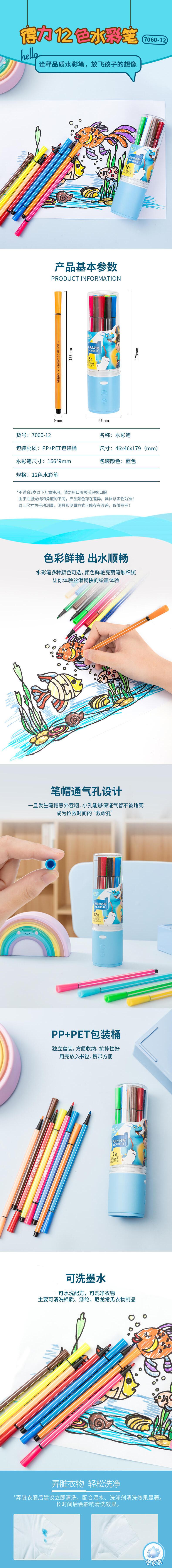 得力 细六角杆水彩笔 7060-12 12色 蓝 1桶