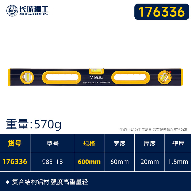 长城精工 双面铣大水泡水平尺 176336 GWP-983-1B 600mm 1把