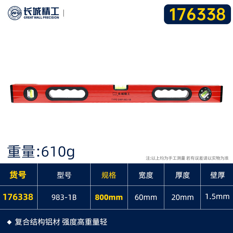长城精工 双面铣大水泡水平尺 176338 GWP-983-1B 800mm 1把