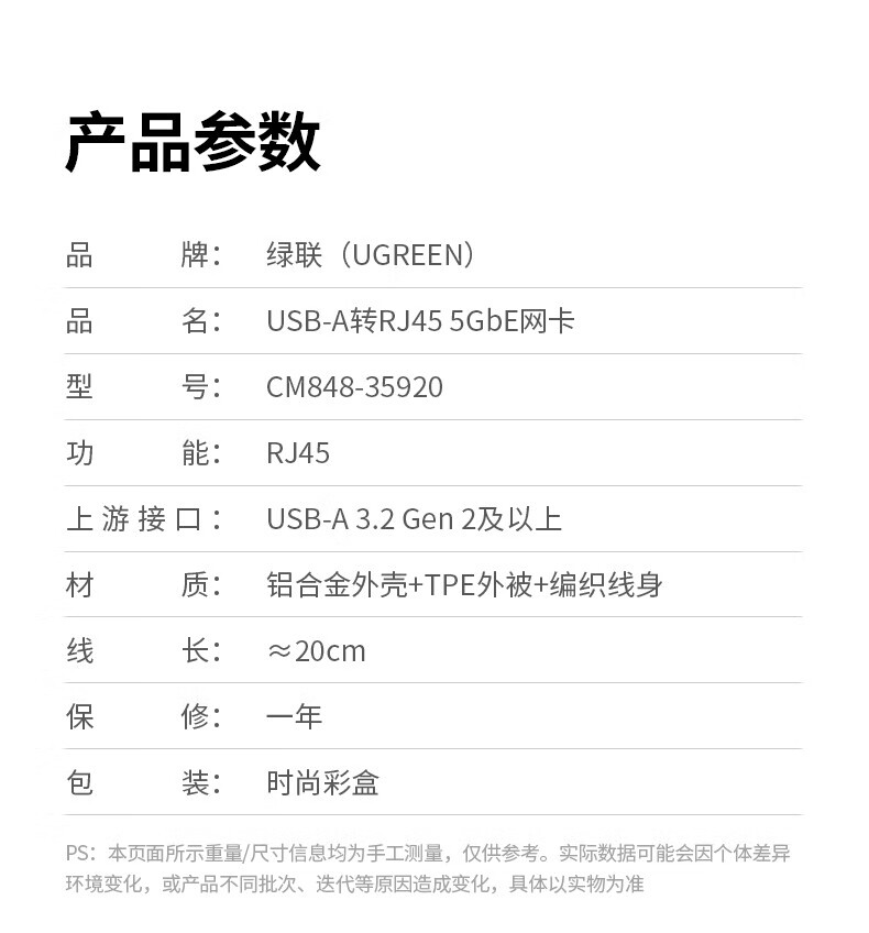 绿联 有线网卡 CM848/35921 Type-C转5G网口 长20cm 1根