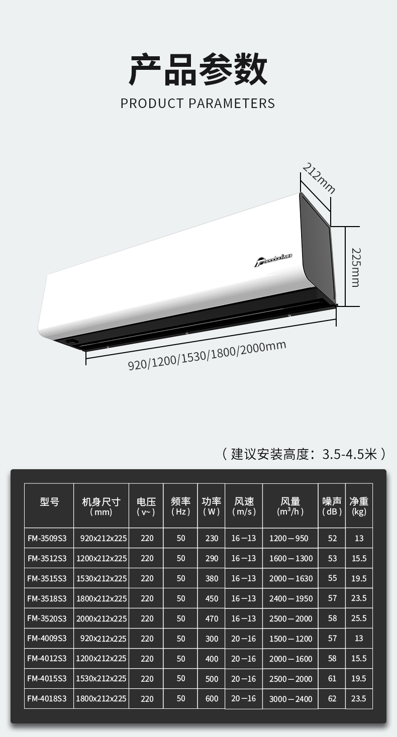 西奥多 S3系列风幕机 FM-3518S3 450W 220V~/50Hz 1800×212×225mm 1台