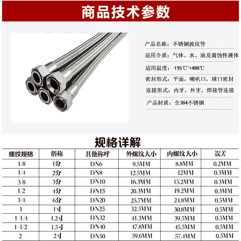 国产通用 304不锈钢编织管 平口内丝 6分*0.3米 1根