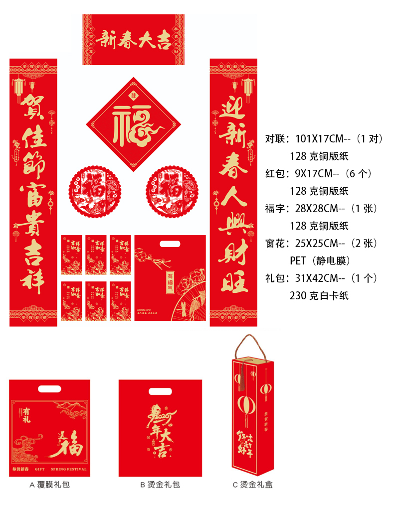 海斯迪克 春联大礼包套装 HKBL1-4 新春大吉 128g铜板纸彩印118cm 对联+红包*6+福字+窗花*2+礼包ABC 七件 1套