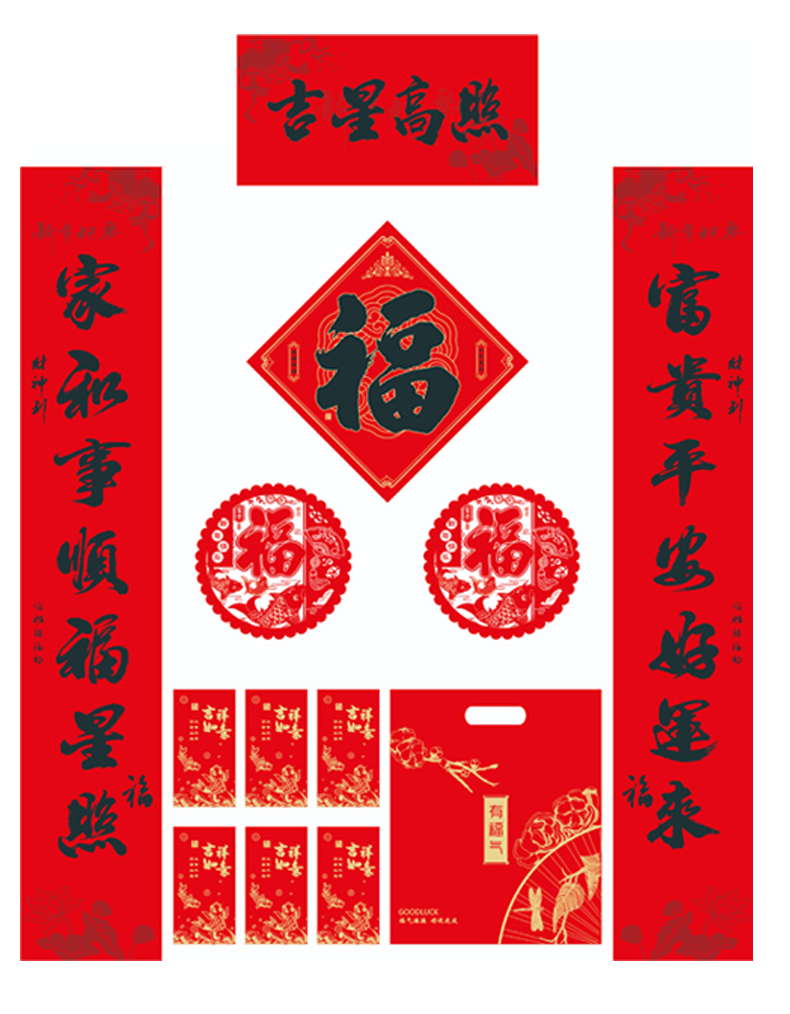 海斯迪克 春联大礼包套装 HKBL2-1 吉星高照 128g铜板纸彩印150cm 对联+红包*6+福字+窗花*2+礼包ABC 七件 1套