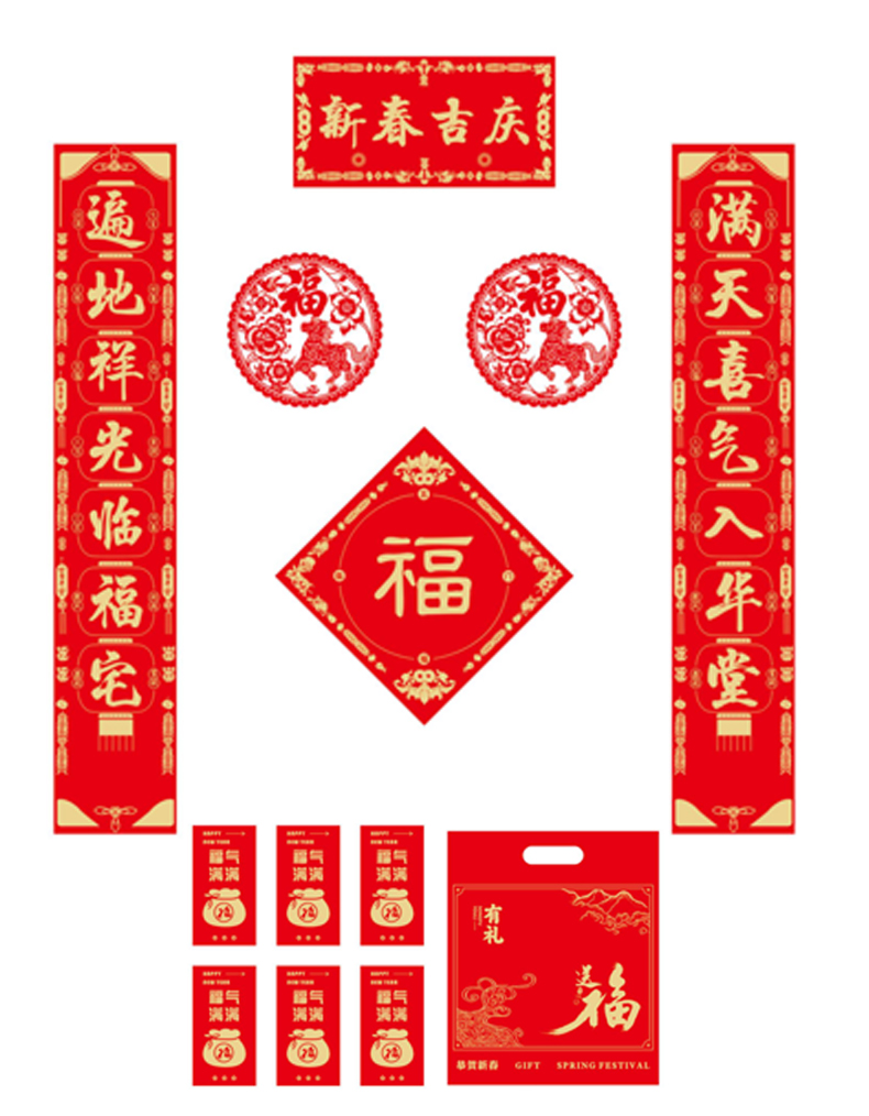 海斯迪克 春联大礼包套装 HKBL4-1 新春吉庆 157g中国红触感纸彩印118cm 对联+红包*6+福字+窗花*2+礼包ABC 七件 1套