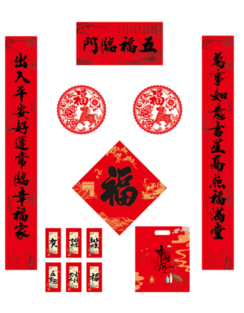 海斯迪克 春联大礼包套装 HKBL6-2 五福临门 157克铜版纸(防晒印刷)220cm 对联+红包*6+福字+窗花*2+礼包ABC 七件 1套