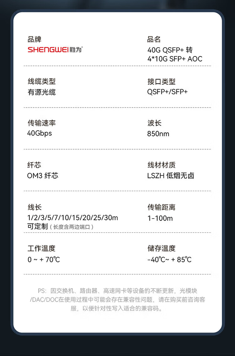 胜为 40G QSFP+转 4*10G SFP+AOC堆叠线 XA0C4120 20m 1条