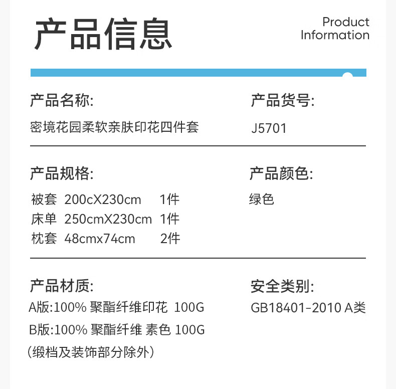 • 商品名称:洁玉 寓·四时系列密境花园柔软亲肤印花四件套