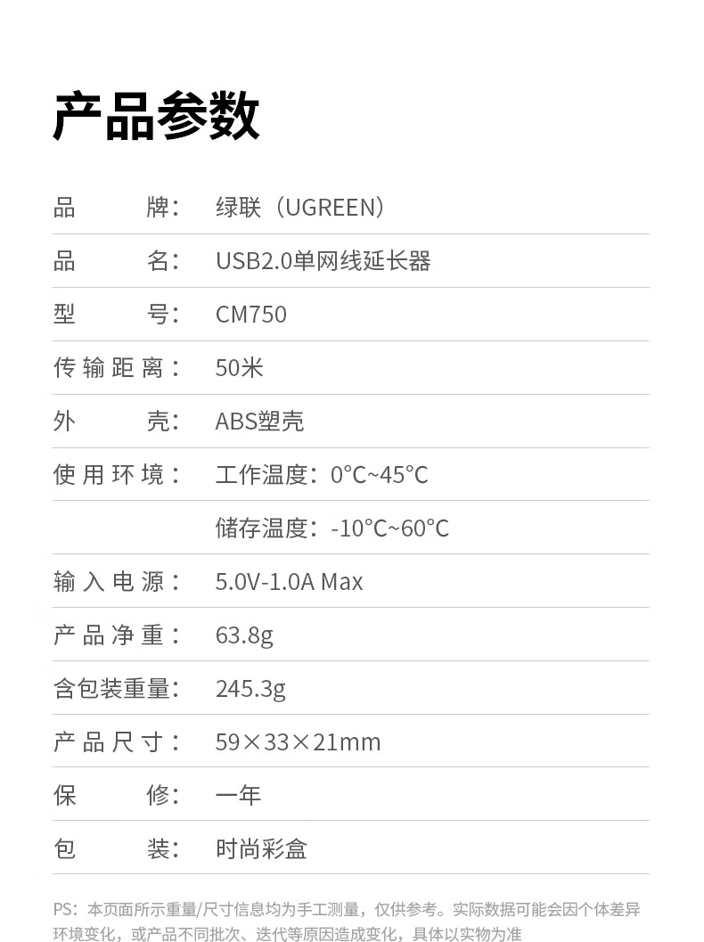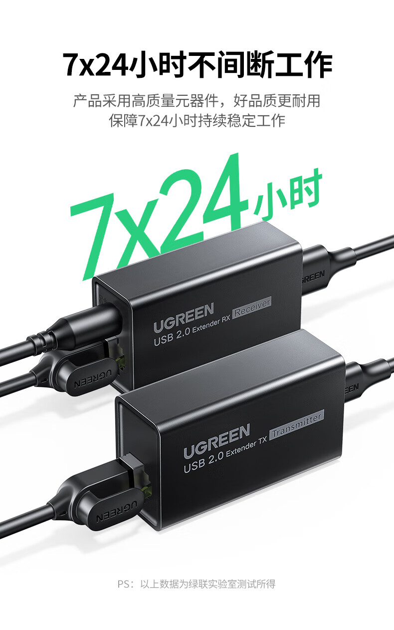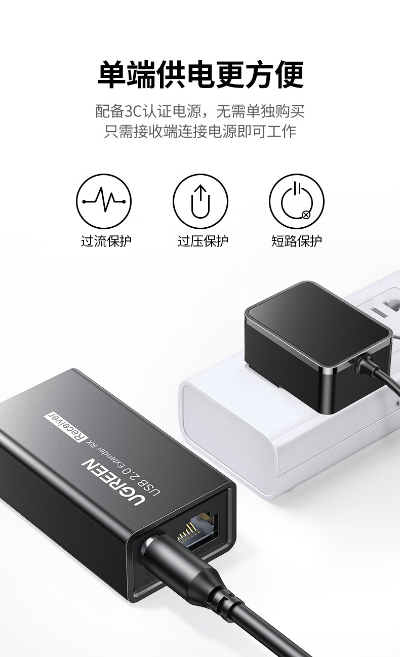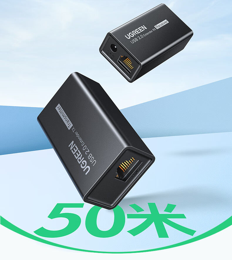绿联 USB2.0单网线延长器胶壳 CM750/35145 带DC电源 50米 1对