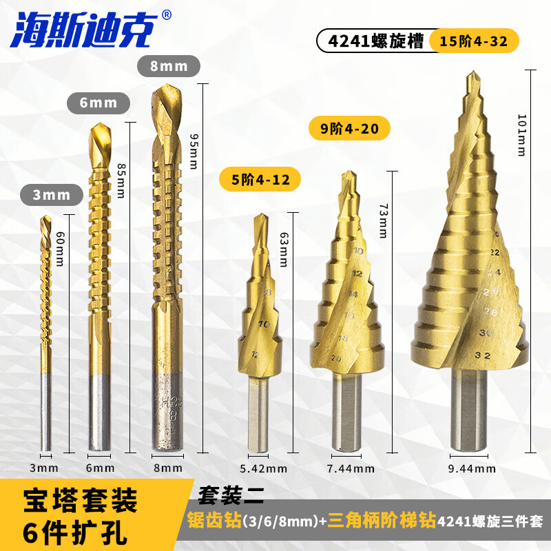 海斯迪克 扩孔6件套 HKsq-403 锯齿钻(3/6/8mm)+三角柄阶梯钻4241螺旋三件套 6件 1套