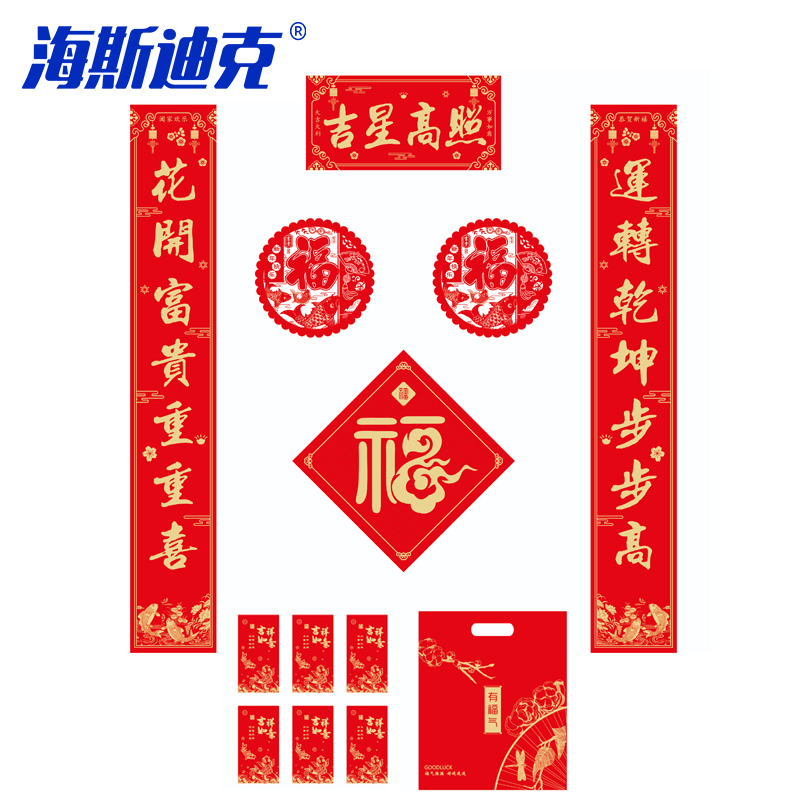 海斯迪克 春联大礼包套装 HKBL1-2 万事顺意 128g铜板纸彩印118cm 对联+红包*6+福字+窗花*2+礼包ABC 七件 1套