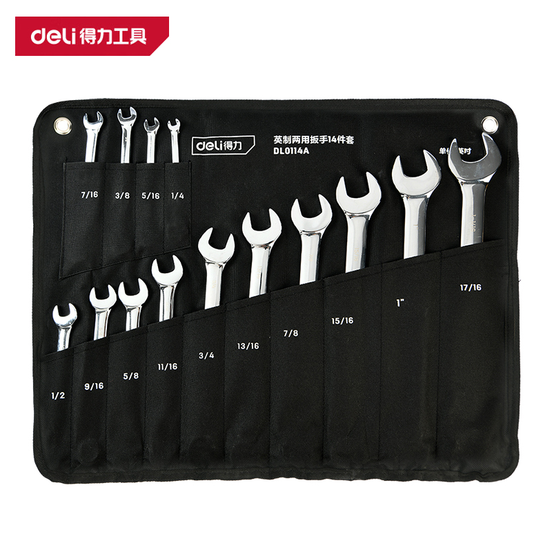 得力 英制镜面两用扳手套装 DL0114A 银色 铬钒钢 布包 14件 1套