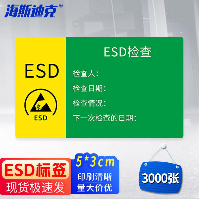 海斯迪克 ESD静电检测标签 HKT-227 铜版纸不干胶 5*3cm 3000张 1包