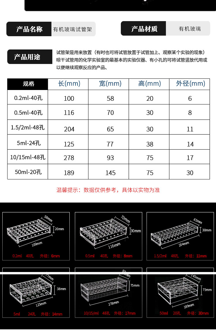 • 包装清单:有机玻璃离心管架*1