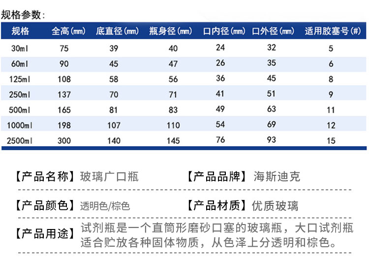 海斯迪克 玻璃广口试剂瓶 HKCL-261 透明 500ml 1个