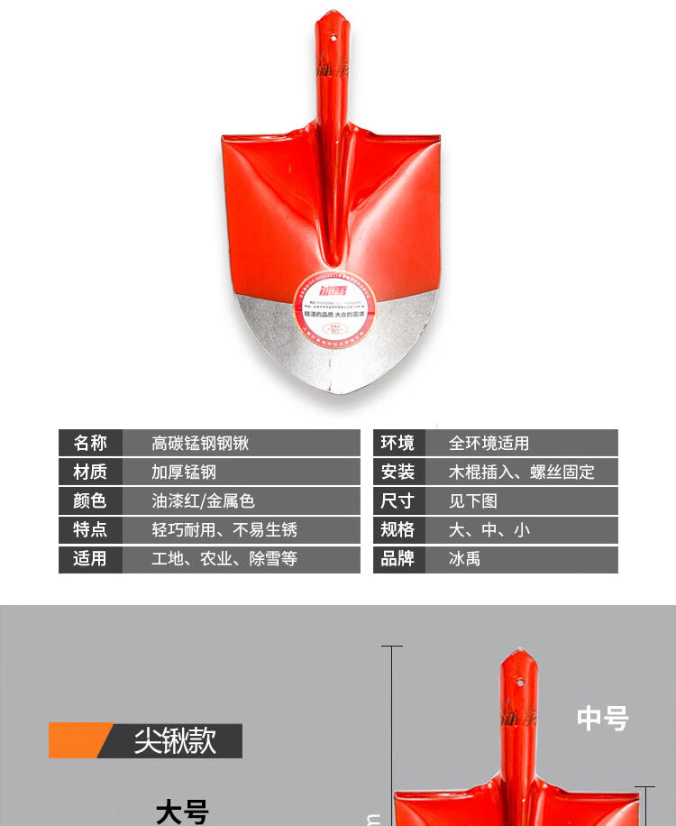 冰禹 铁锹 BY-001 锰钢 中号 尖锹 含柄+3双手套 1件