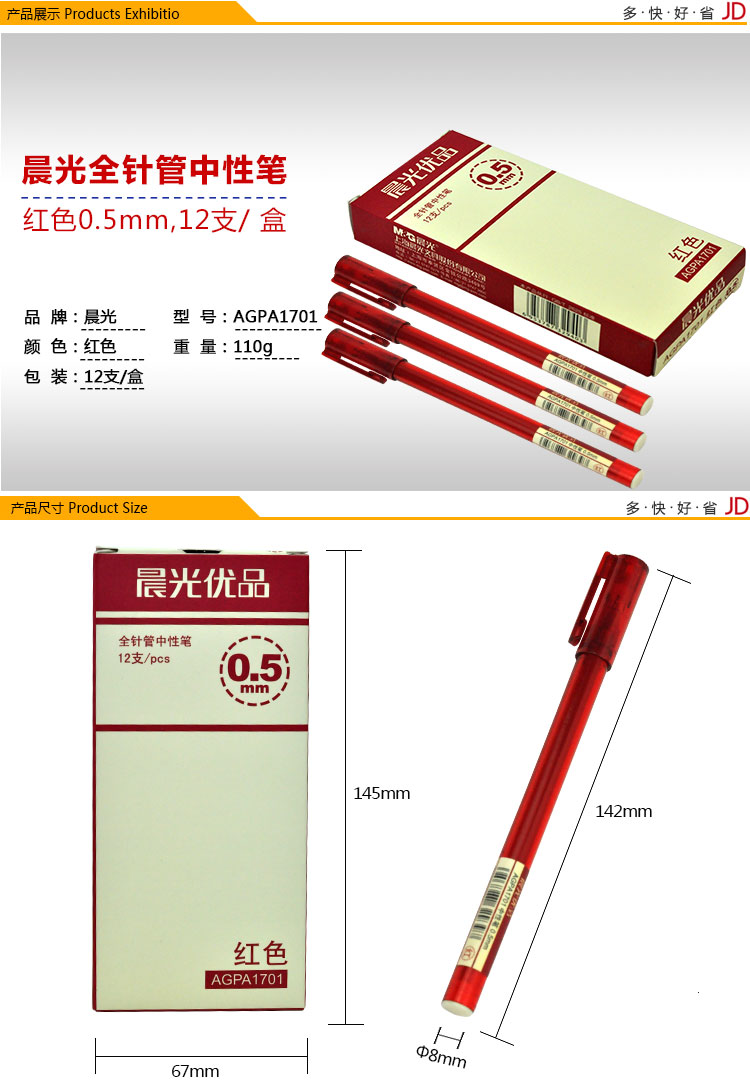 晨光 水性中性笔 AGPA1701 0.5mm 红色 12支*2盒 1件