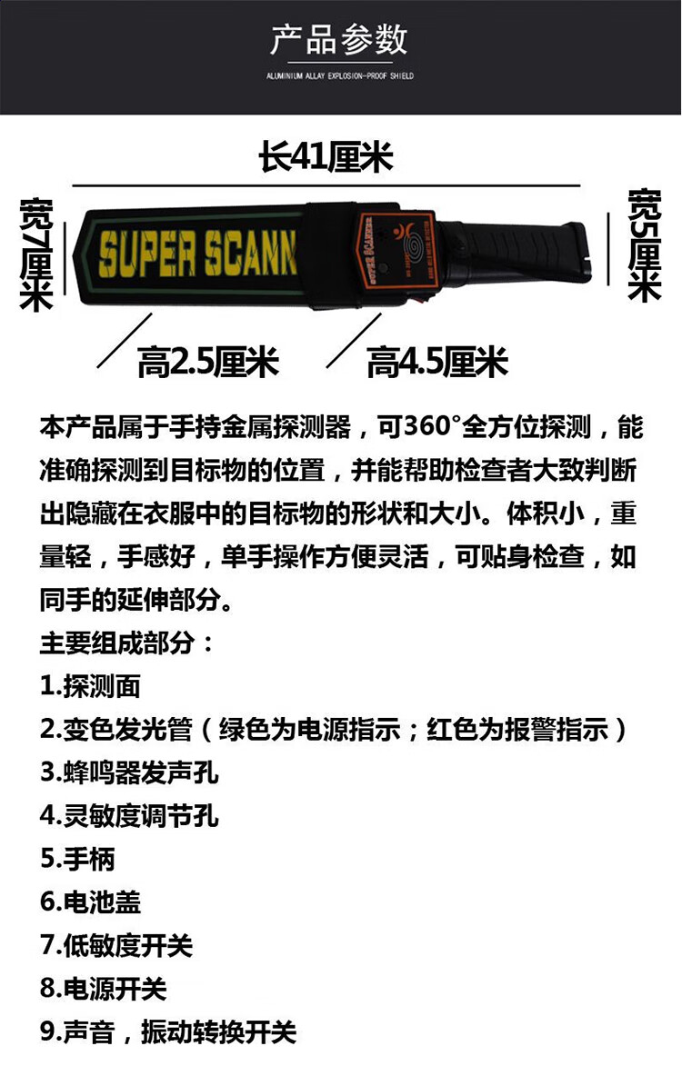 海斯迪克 安检手持金属探测仪探测器 HK-69 充电款 41*7cm 1个