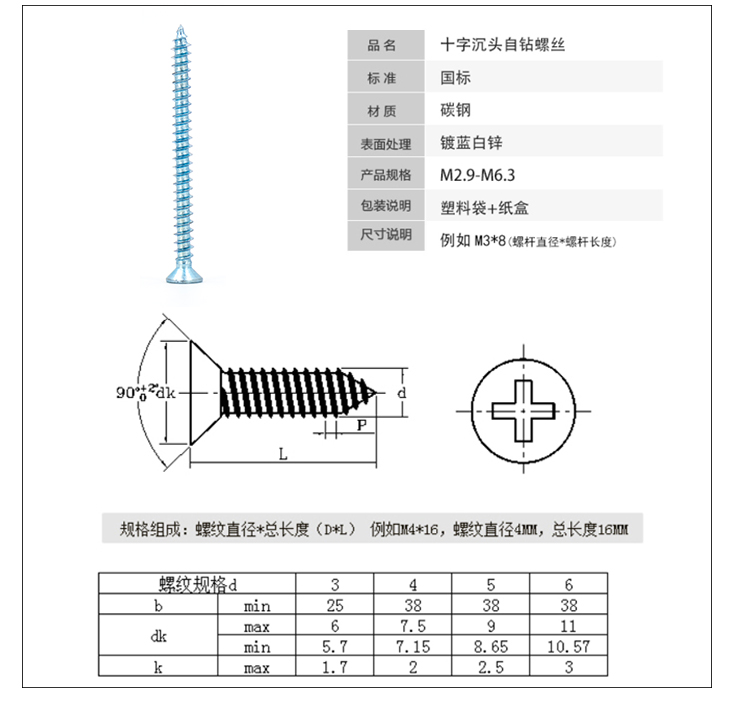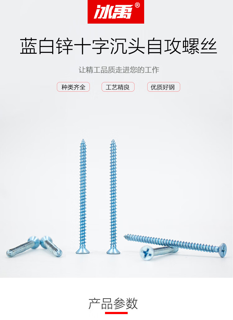 冰禹 加硬沉头十字自攻螺丝 ICEY-381 碳钢 4*60mm 蓝白锌 GB846-76 HC型 100颗 1包