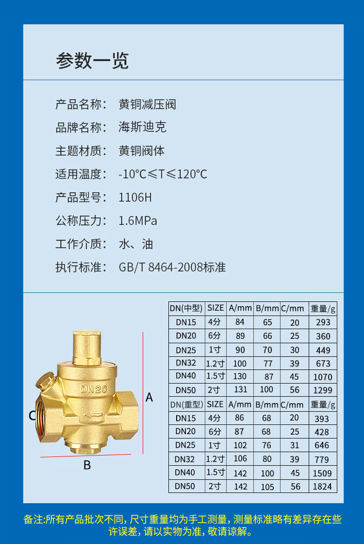 海斯迪克 可调式减压阀 HKCX-56 黄铜 DN20 中型 1个