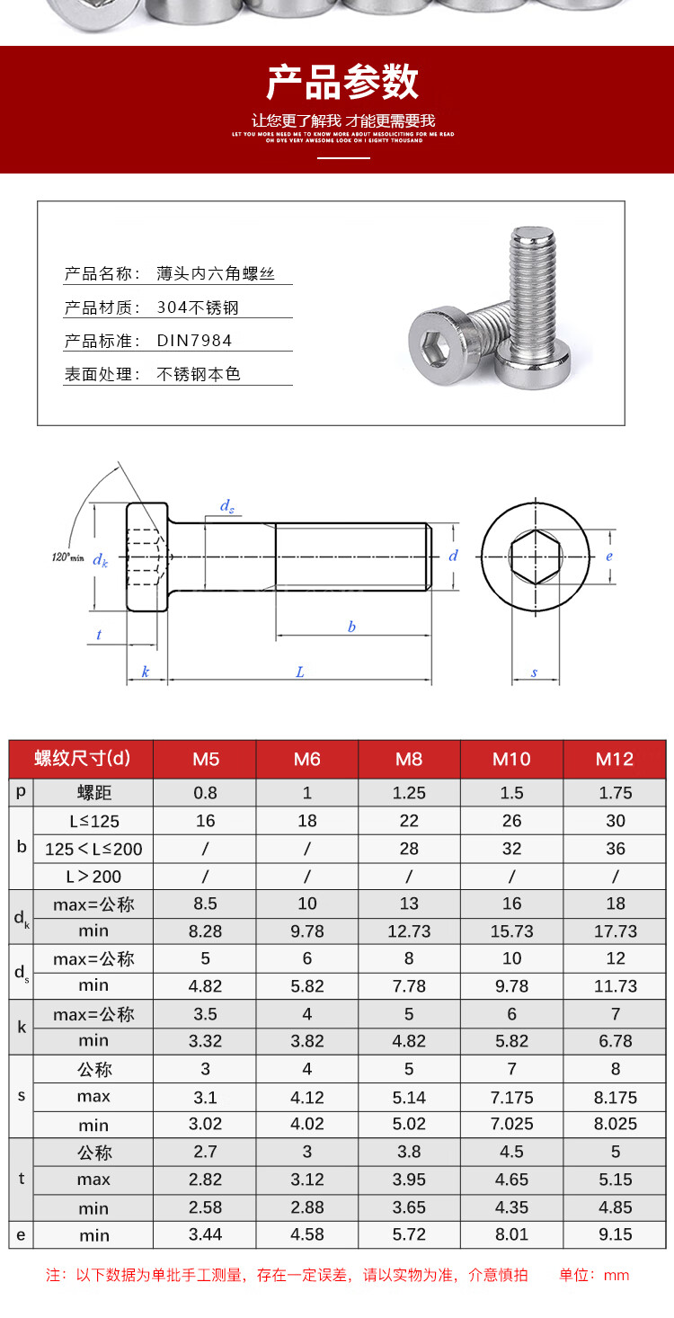 海斯迪克 圆柱薄头内六角螺丝 HKYC-70 304不锈钢 DIN7984 M8*50 20个 1包