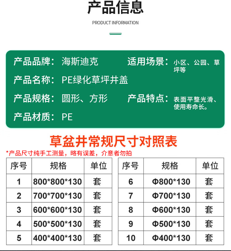 海斯迪克 PE绿化草坪井盖 HKCX-140 绿色 φ500mm 方形 1个