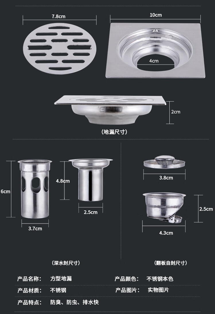 冰禹 深水封加厚地漏 BY-1252 不锈钢 10*10cm 单用款翻板自封 1个