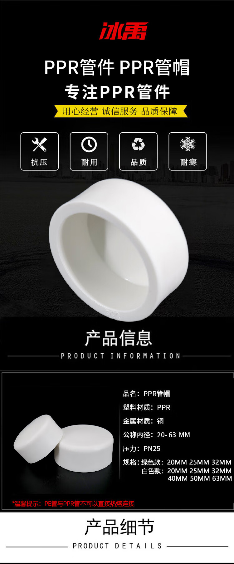 冰禹 PPR管件堵头 BYxh-11 白色 63mm 1个