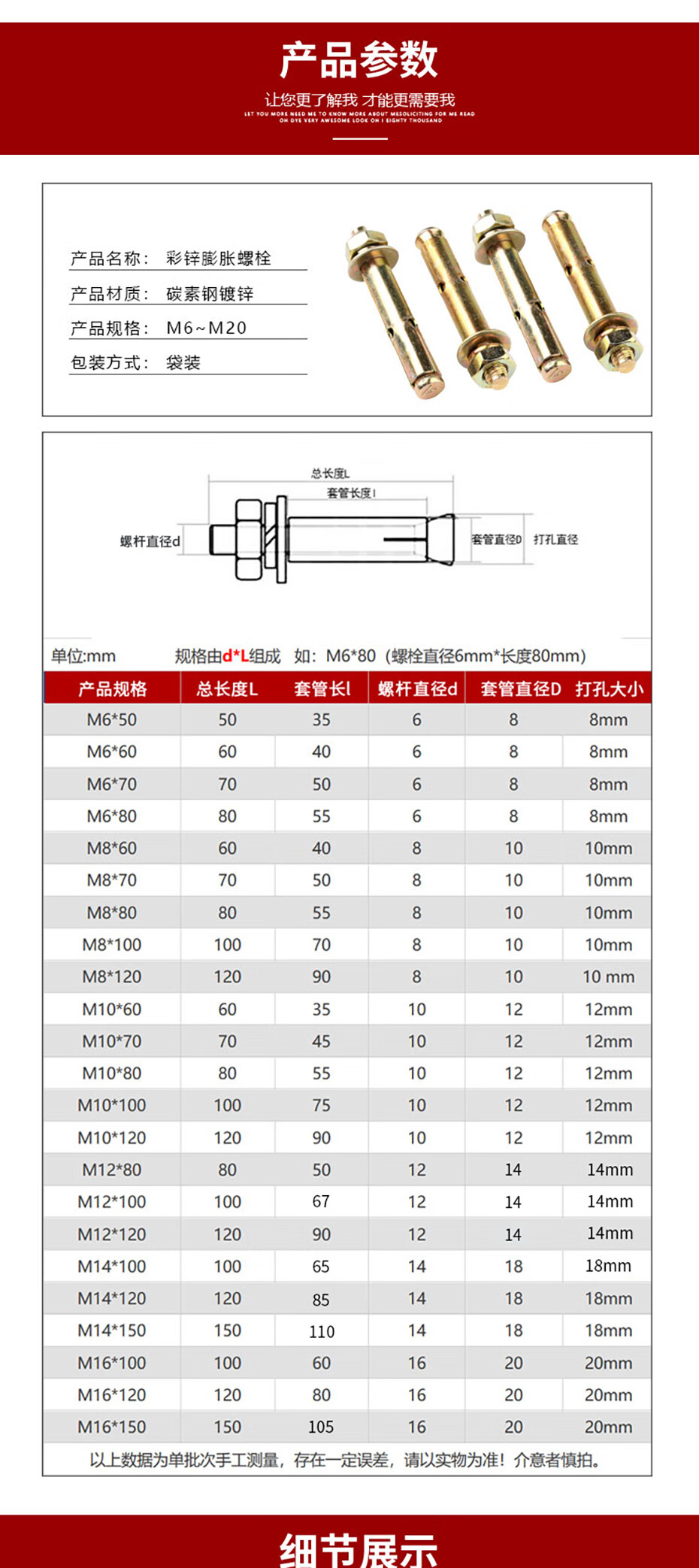 海斯迪克 镀彩锌膨胀螺栓 HKL-923 M6×60 10个 1包