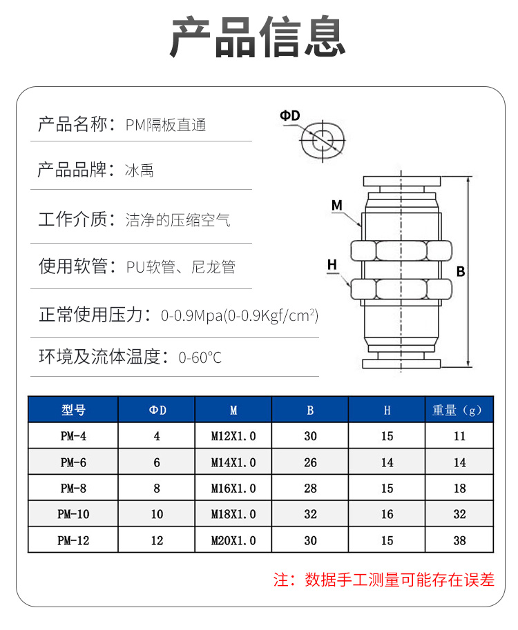 冰禹 PM隔板直通接头 BYA-322 PM-06 10个 1件