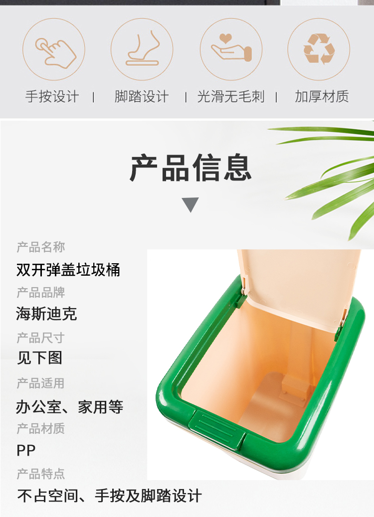 海斯迪克 多功能弹盖垃圾桶 HKY-231 PP 空白桶 30*22.5*37cm 1个