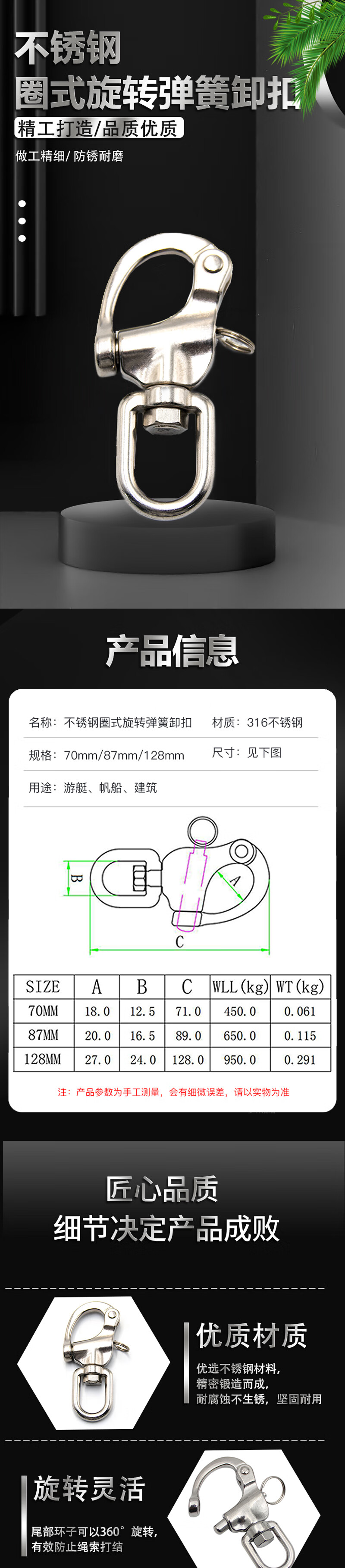 冰禹 圈式旋转弹簧卸扣[下架] BYZJ-116 316不锈钢 128mm 1个