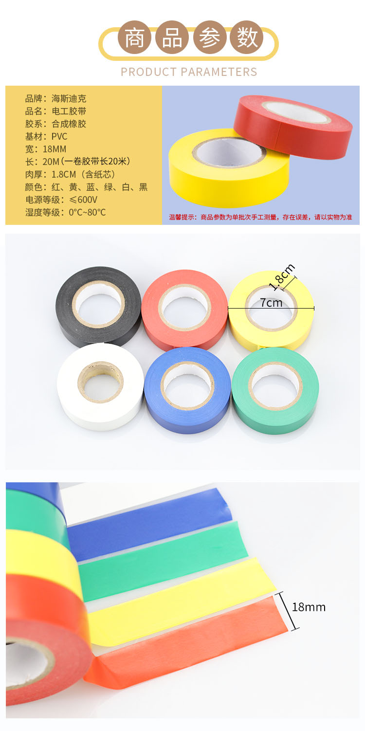 海斯迪克 彩色PVC电工胶布 gnjz-5376 黄色 18*20m 10卷 1箱