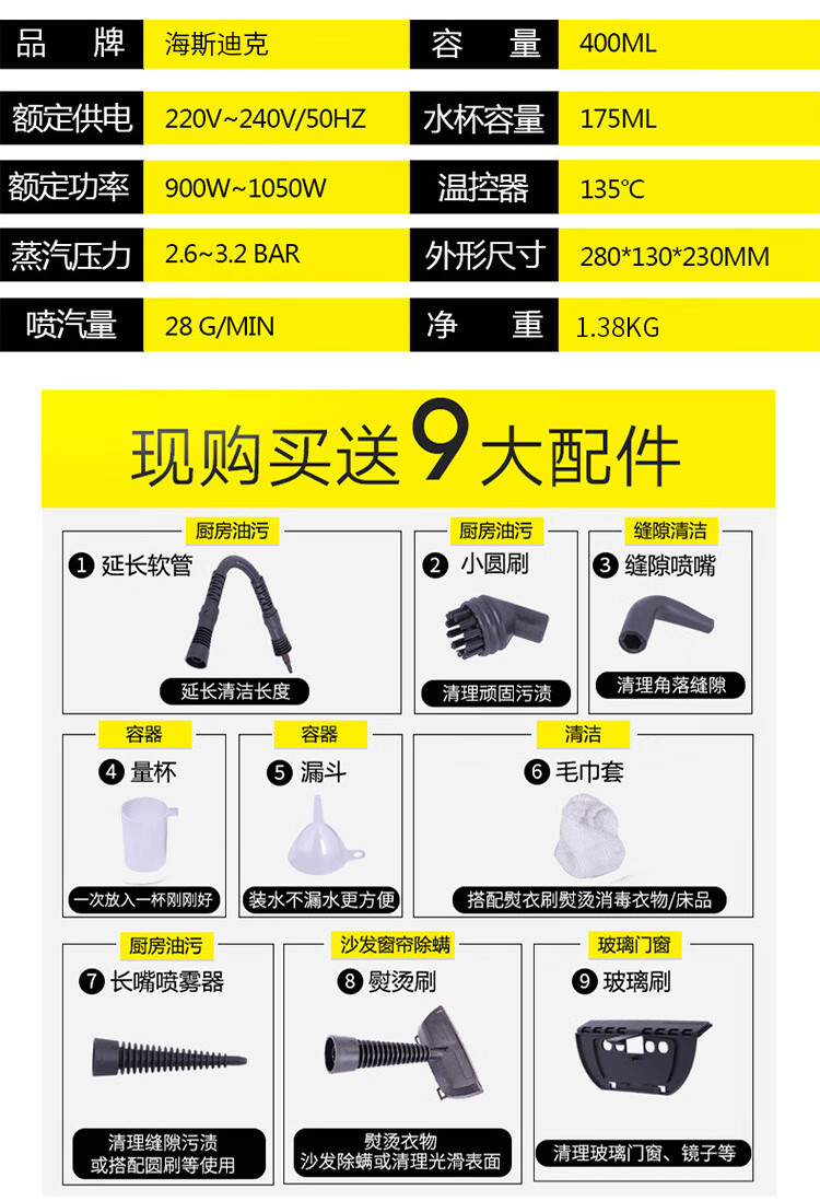 海斯迪克 手持式多用途清洗机 HKY-244 黄色900W(250ml套装) 1个