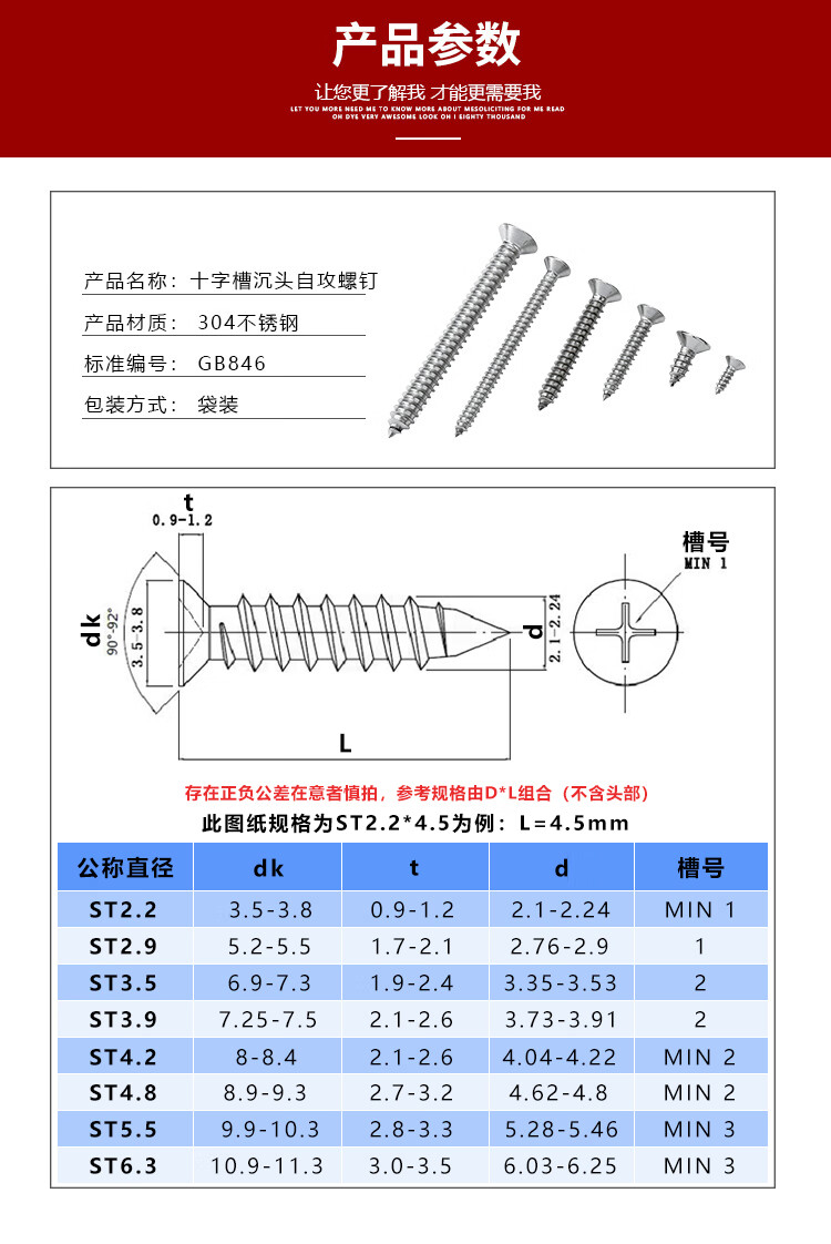 海斯迪克 十字槽沉头自攻螺丝钉 gnjz-7207 304不锈钢 GB846 本色 ST3.5×40mm 100个 1包