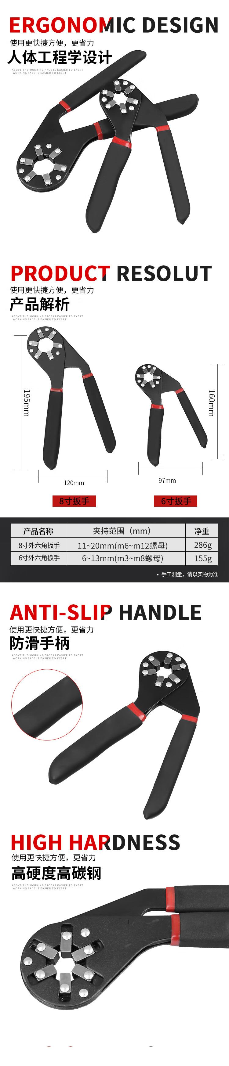 海斯迪克 可夹持外六角魔术扳手 gnjz-799 8寸 红黑色 1把