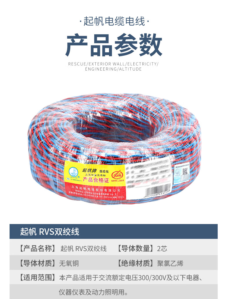 起帆 铜芯聚氯乙烯绝缘绞型软电线 RVS2*1.0 红蓝 100米 1卷