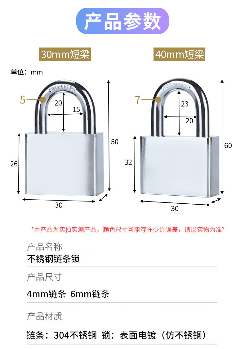 • 规格4mm链条1米+30mm电镀锁
