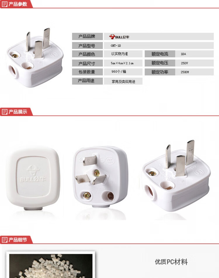 公牛 单相三极插头 GNT-10S 2500W 1个
