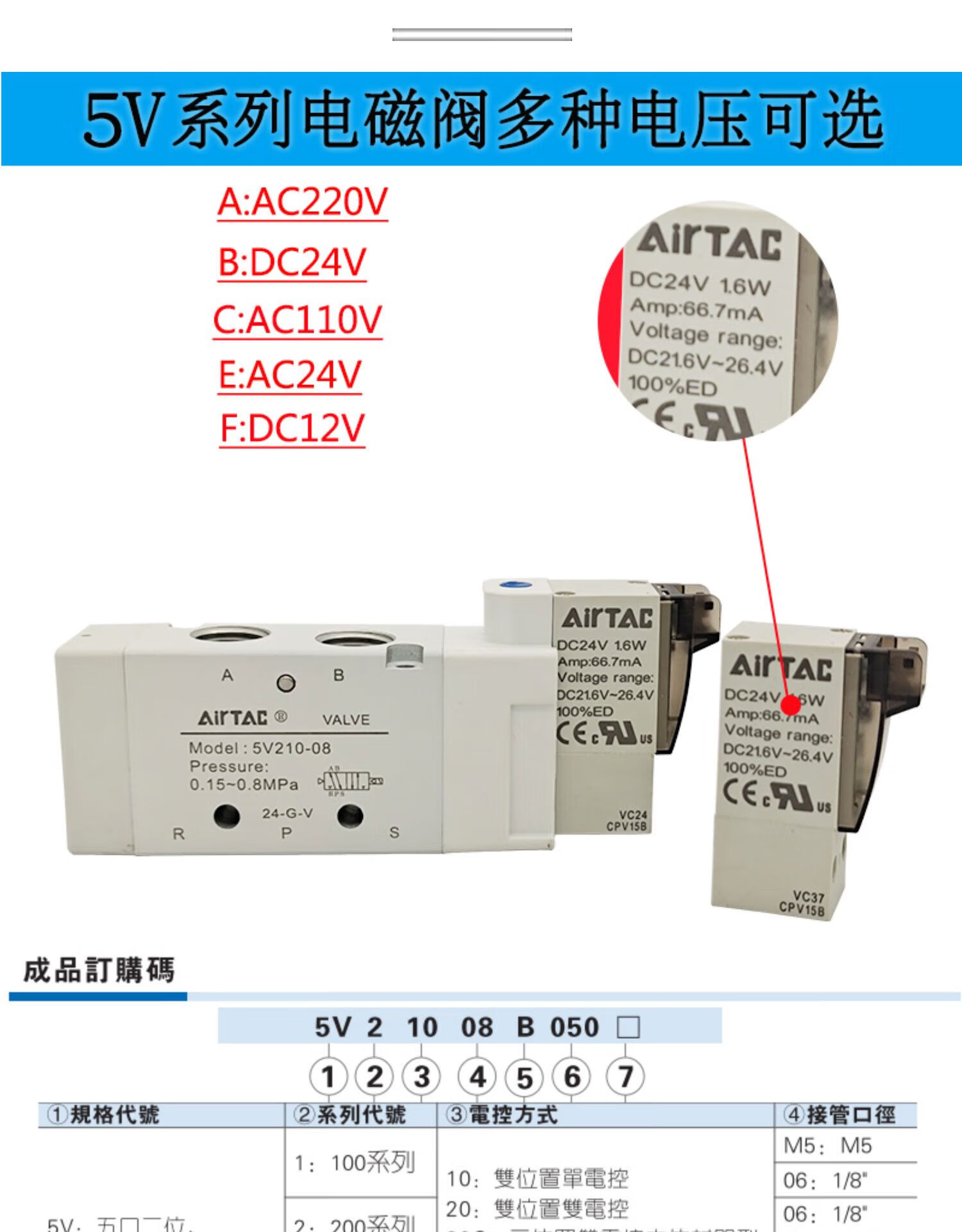 亚德客 电磁阀 5V310-08-B DC24V端子 1个