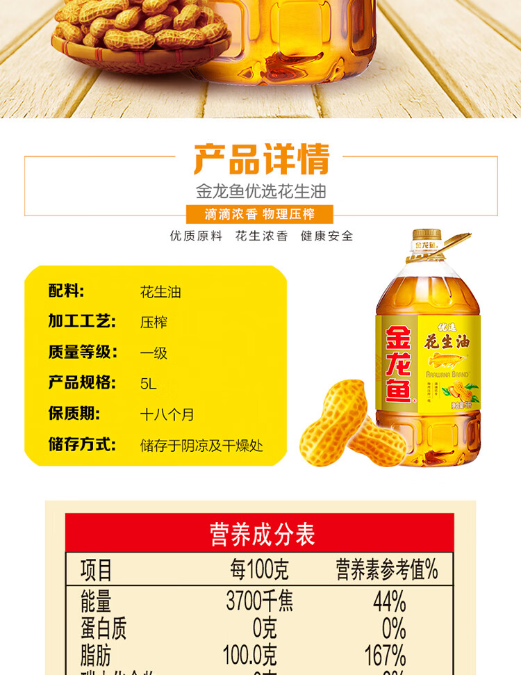 金龙鱼 物理压榨醇厚优选花生油 5L 1桶