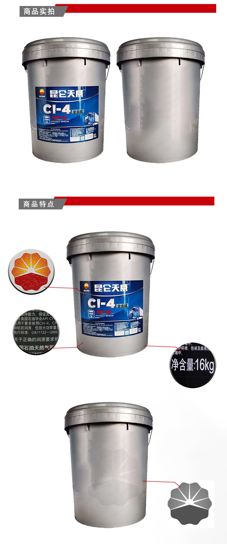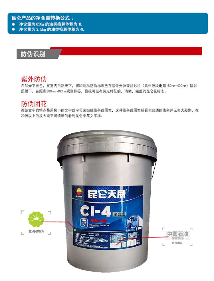 昆仑 发动机机油 CI-4 5W-40 天威 18L 1桶