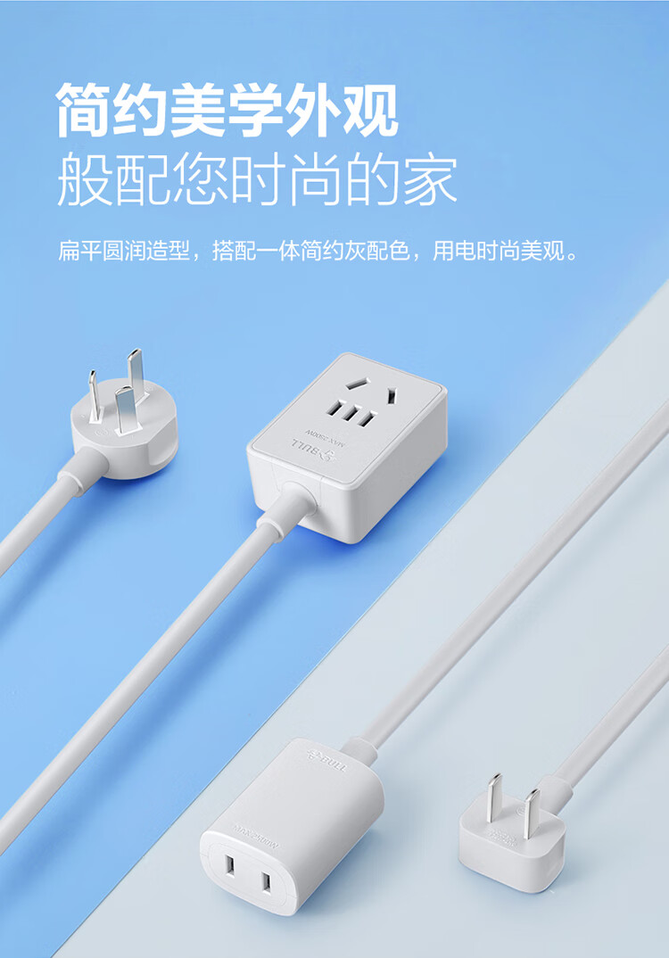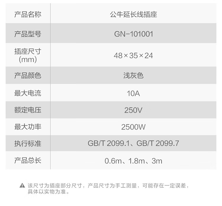 公牛 插线板 GN-101001 方扁插1位无开关全长3米 白色 1个
