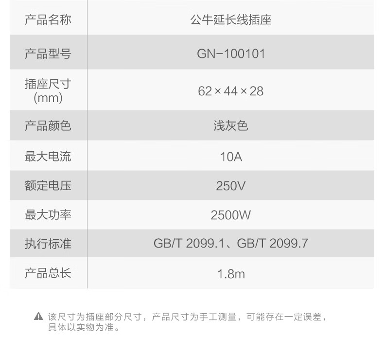 公牛 插线板 GN-100101 方形1位无开关全长1.8米 白色 1个
